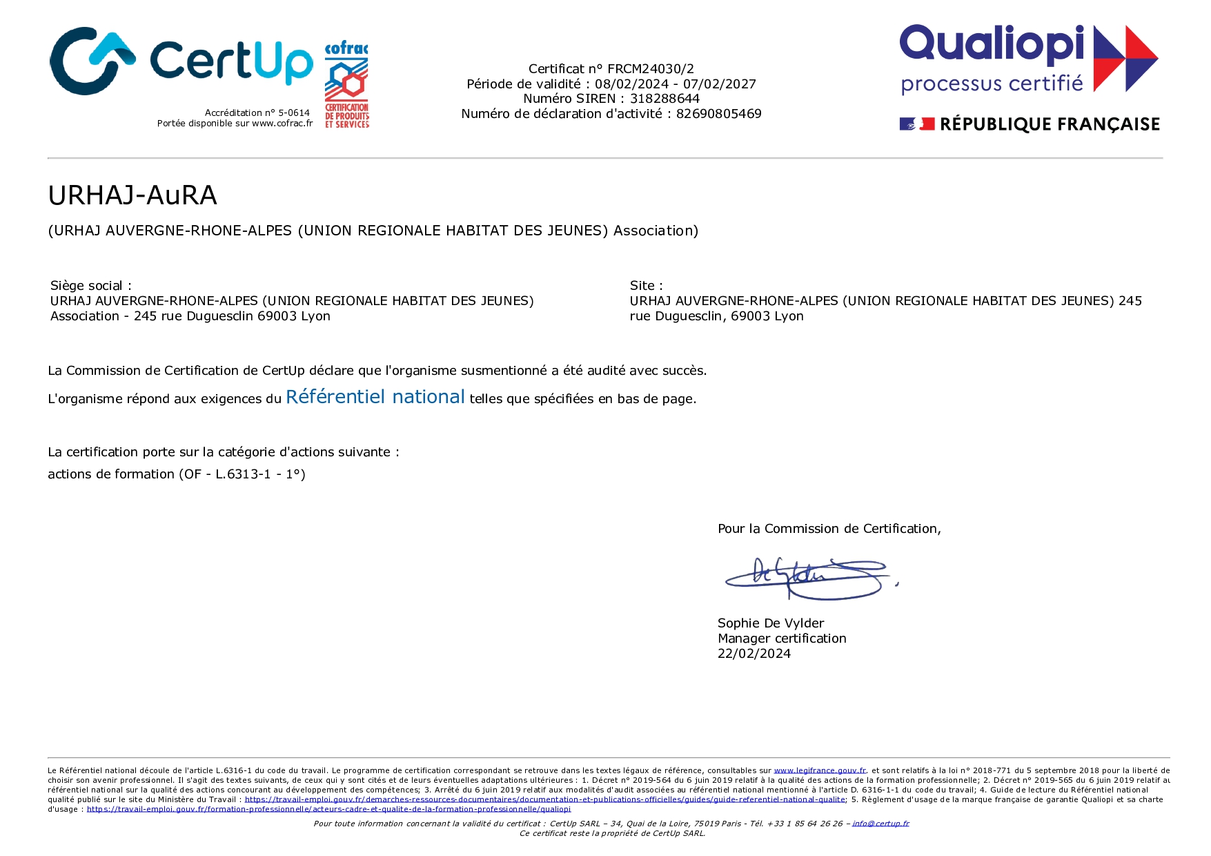 Certification Qualiopi renouvelée L’URHAJ a été audité avec succès le 21/12/2023 et la certification Qualiopi renouvelée jusqu’au 7/02/2027 Voir la certification